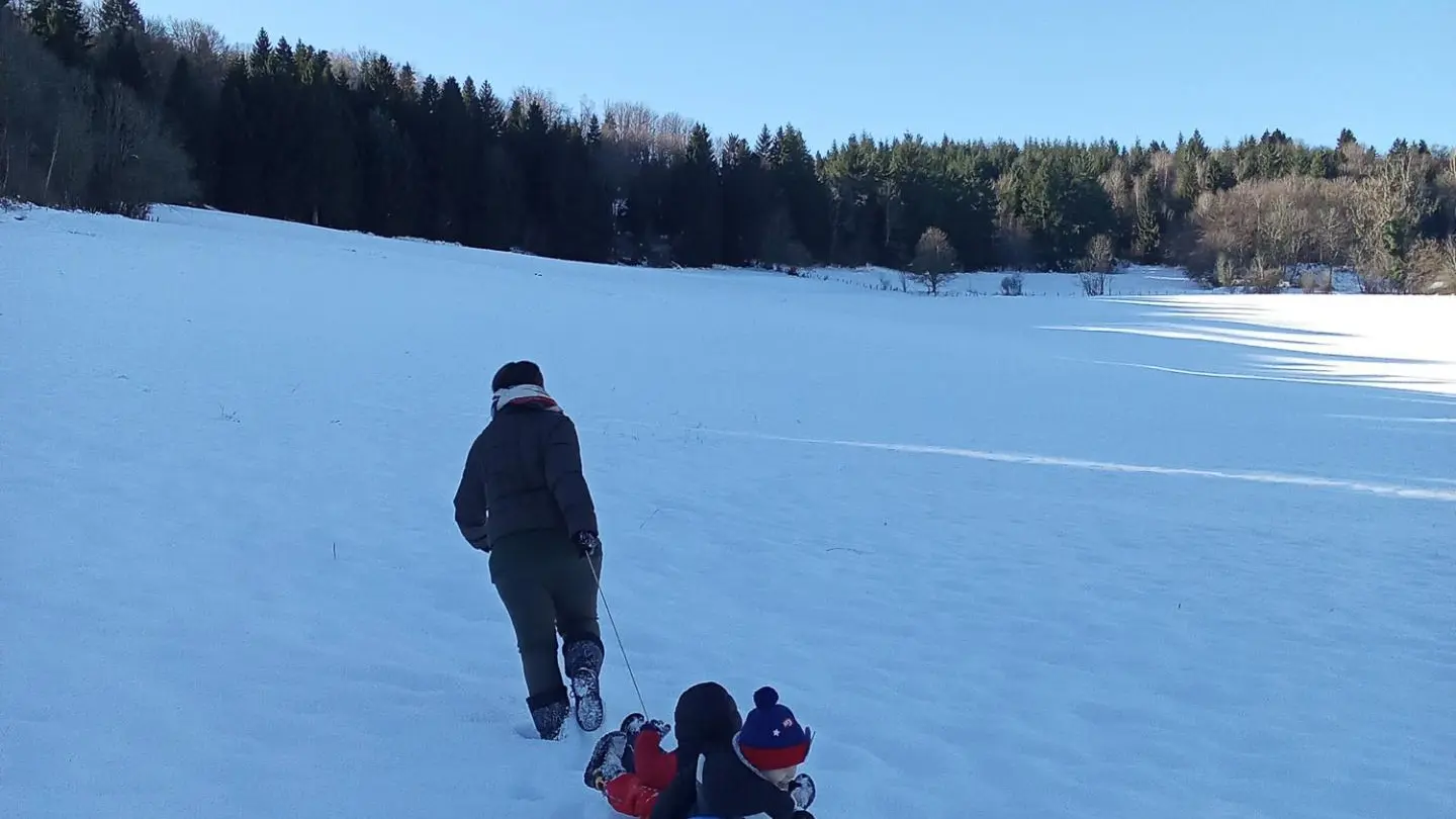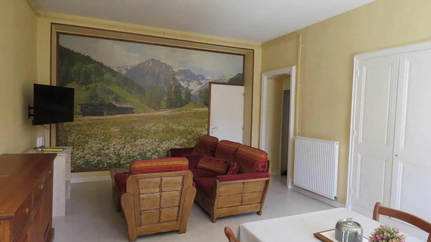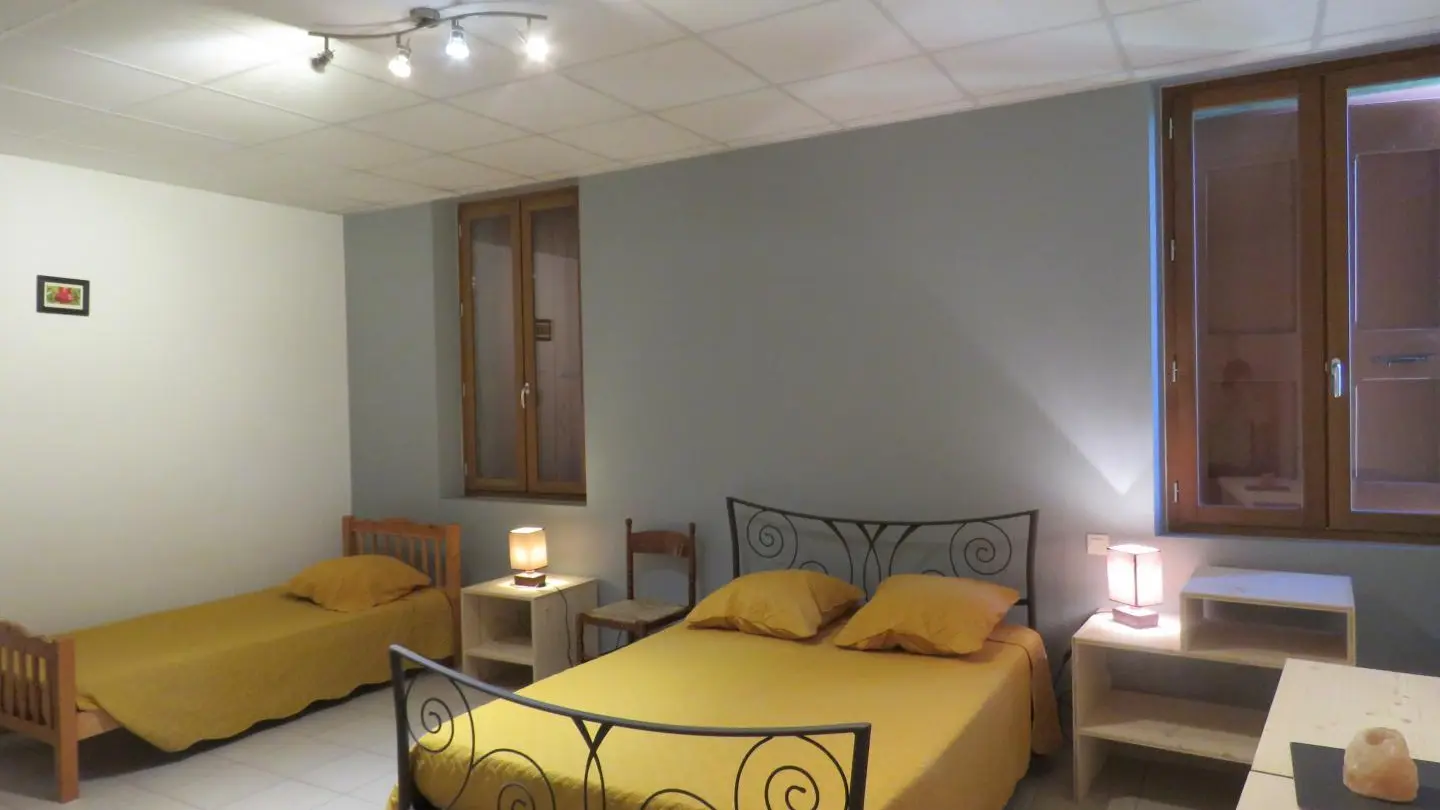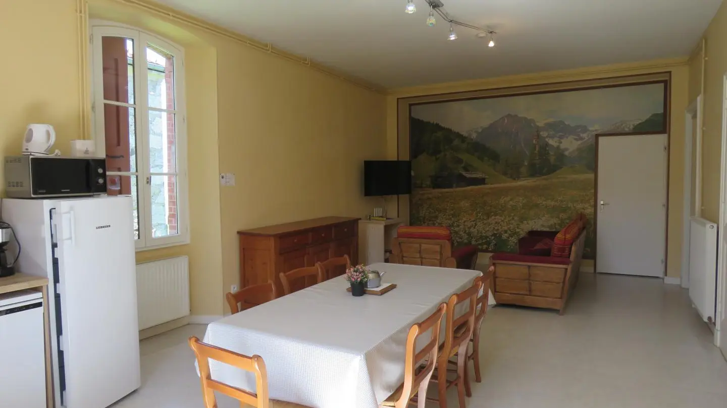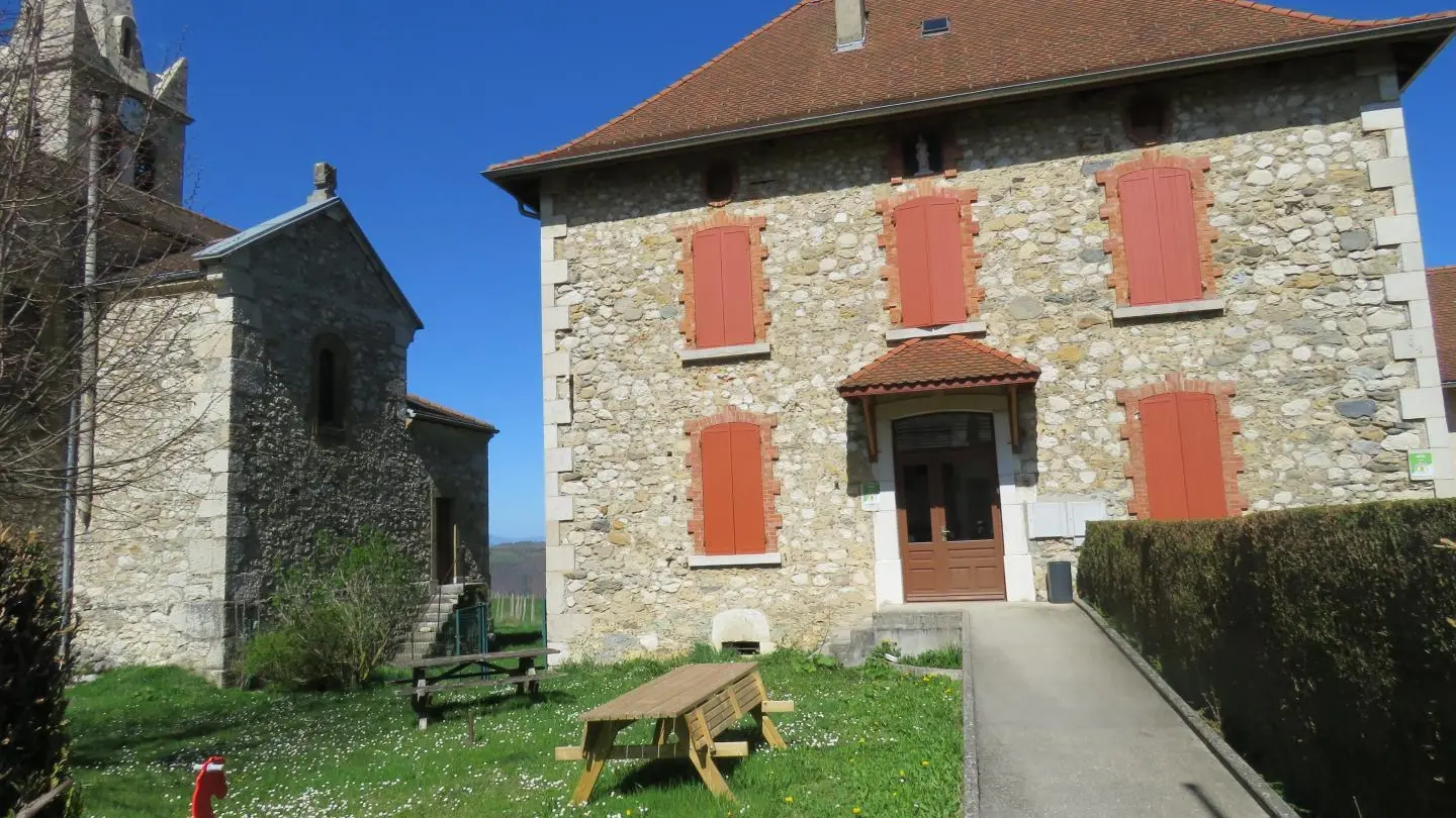 Restored former rectory by the church converted into two adjoining gites. Gite 1: on grd fl: hall, large living rm/kitchen, WC. On 1st fl, Bdrm 1 (2 single beds), Bdrm 2 (1 double bed), Bdrm 3 (1 double bed + 1 child's bed), bathrm, CH, washing m/c. Fenced-off grounds with garden furniture and BBQ. Shared car park. TV. Skiing: St Pierre de Chartreuse, Grde Chartreuse cellars at Voiron (20 km), Paladru and Aiguebelette lakes, hiking, mountain biking.