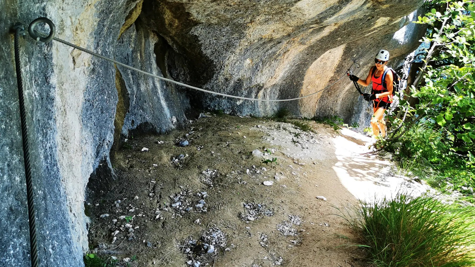 The route continues, passing the ‘Pont des Balmes’, to reach a vertical section. Halfway up, there is an overhang that is not very difficult to pass.