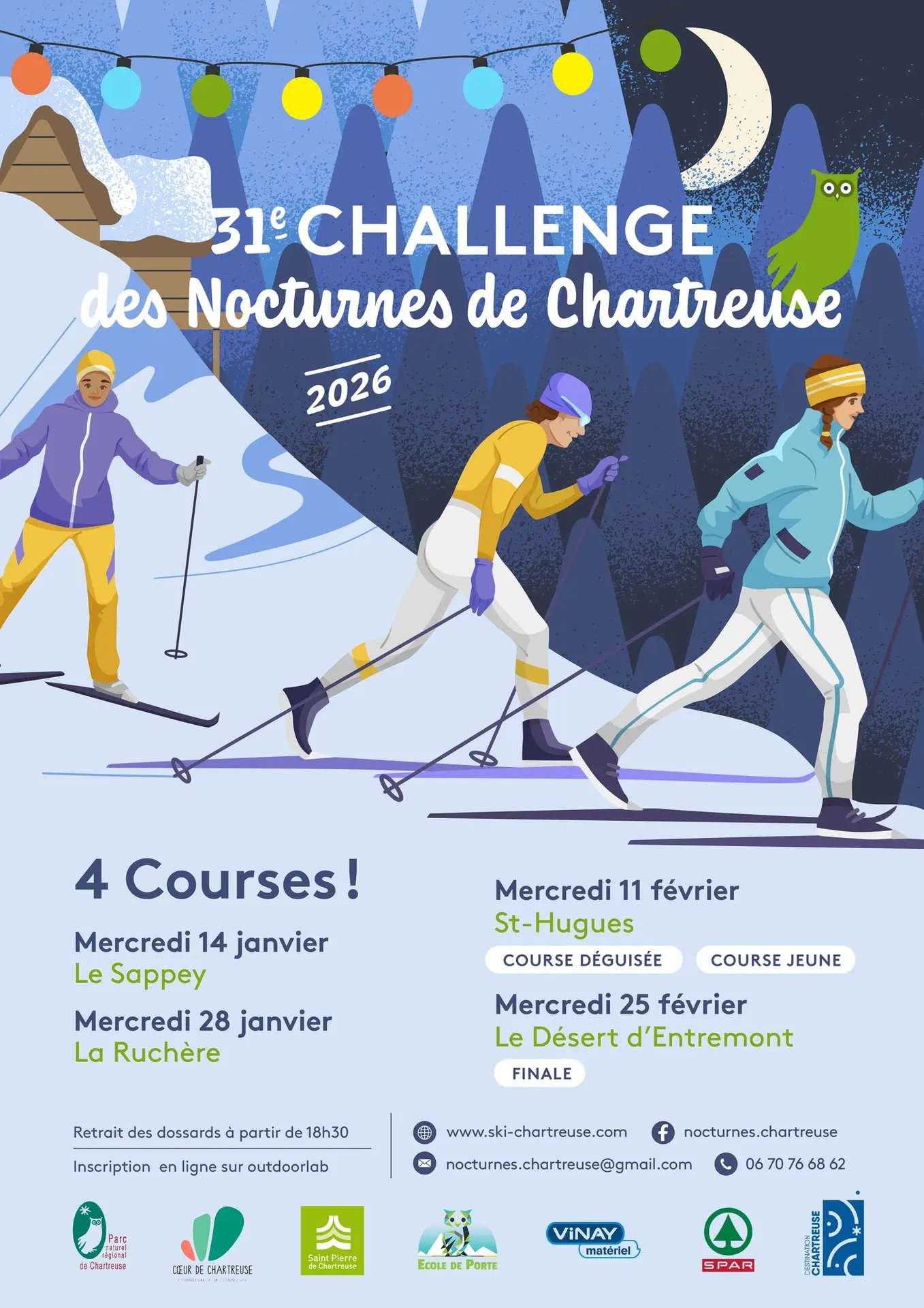Le Challenge des Nocturnes de Chartreuse propose un circuit original de courses à l’américaine, en relais de ski nordique, organisé sur les 4 sites nordiques de Chartreuse. En soirée, les participants s’affrontent par équipes dans une ambiance conviviale, festive et sportive. Ce challenge met en avant le plaisir de la glisse, la découverte du massif de nuit et le partage d’un moment chaleureux au cœur des villages et sites nordiques de Chartreuse.