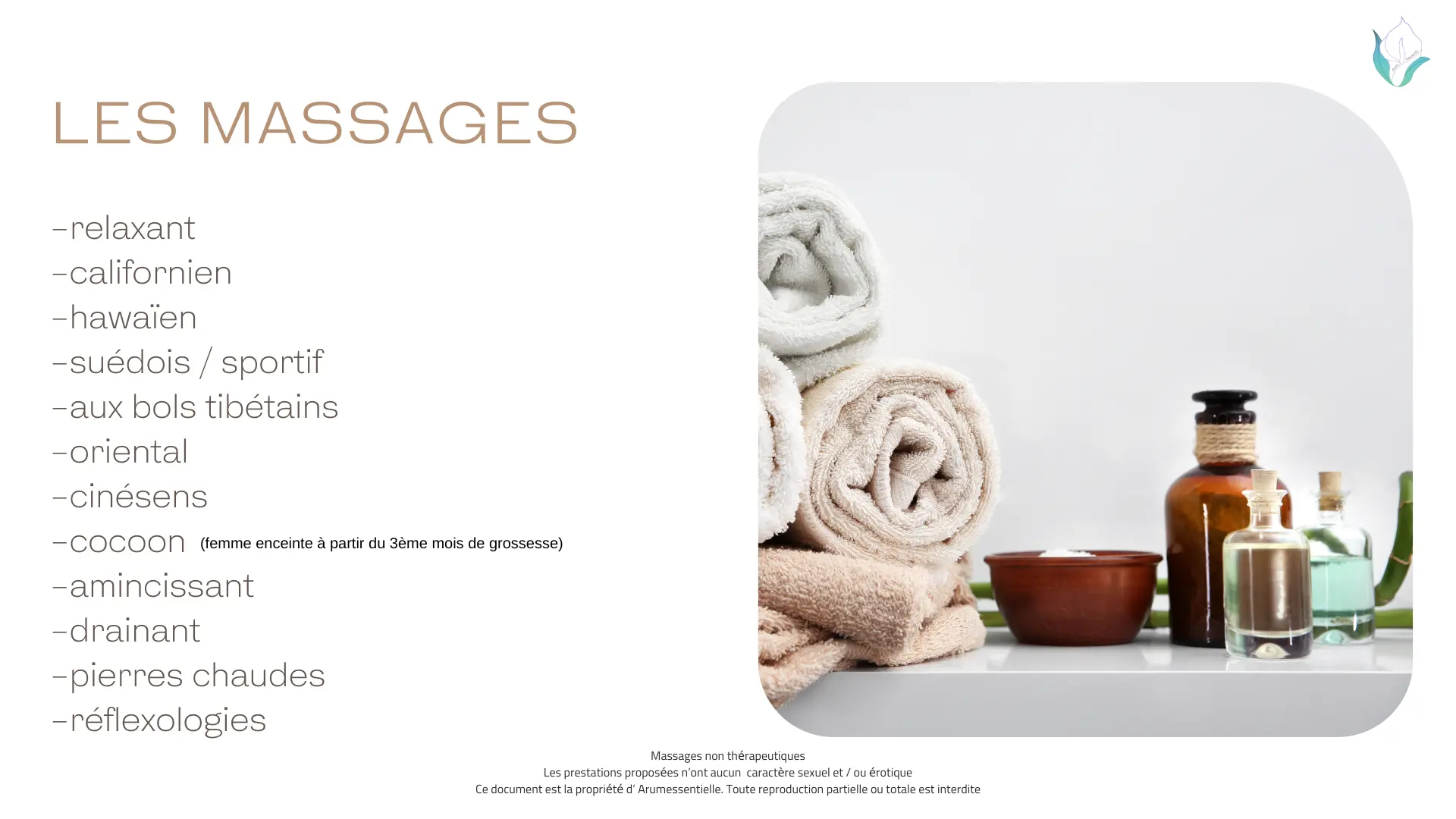Les massages pratiqués n'ont aucun caractère sexuel ou érotique et sont exclusivement dédiés au bien-être et à la relaxation.