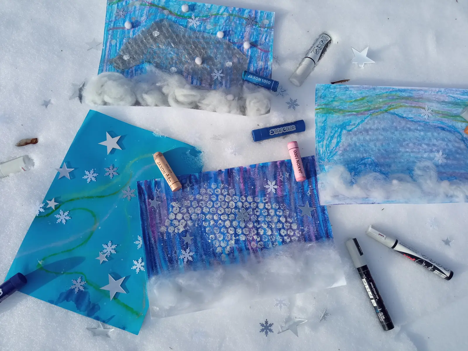 Un ours polaire fait de bulles a le regard perdu dans les aurores boréales tout en marchant sur une neige de coton. Voilà de quoi faire rêver les tout jeunes artistes lors de cet atelier peinture et collage.