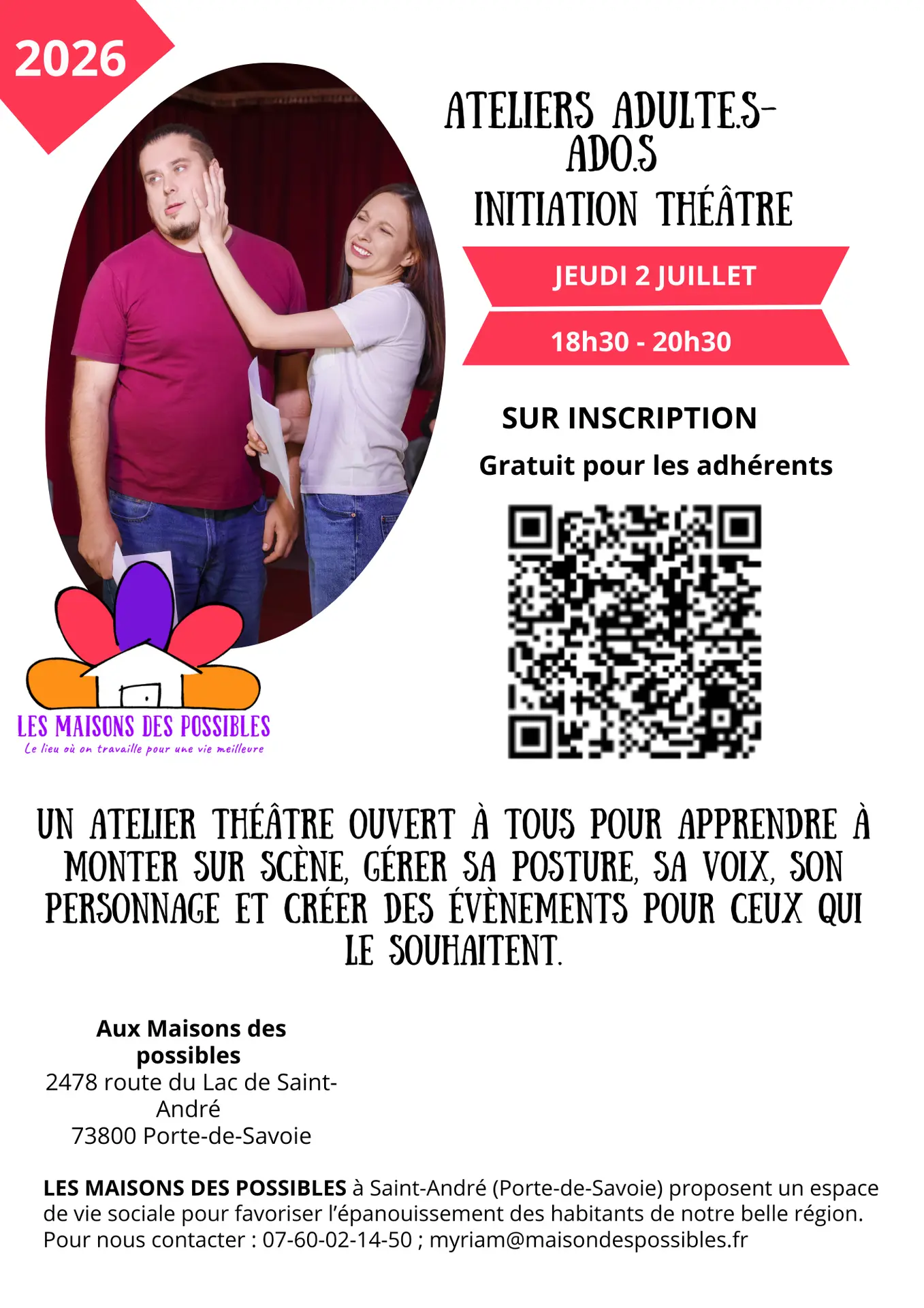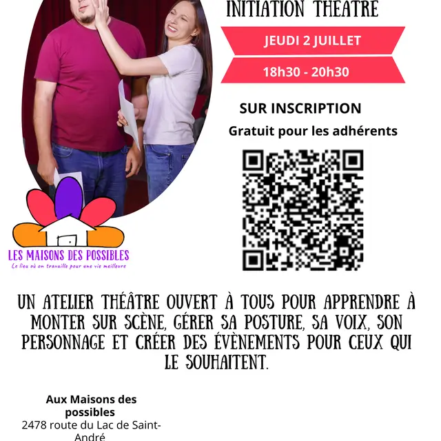Atelier théâtre ouvert à tous : apprenez à monter sur scène, travailler votre posture, votre voix et votre personnage, avec possibilité de créer des événements.