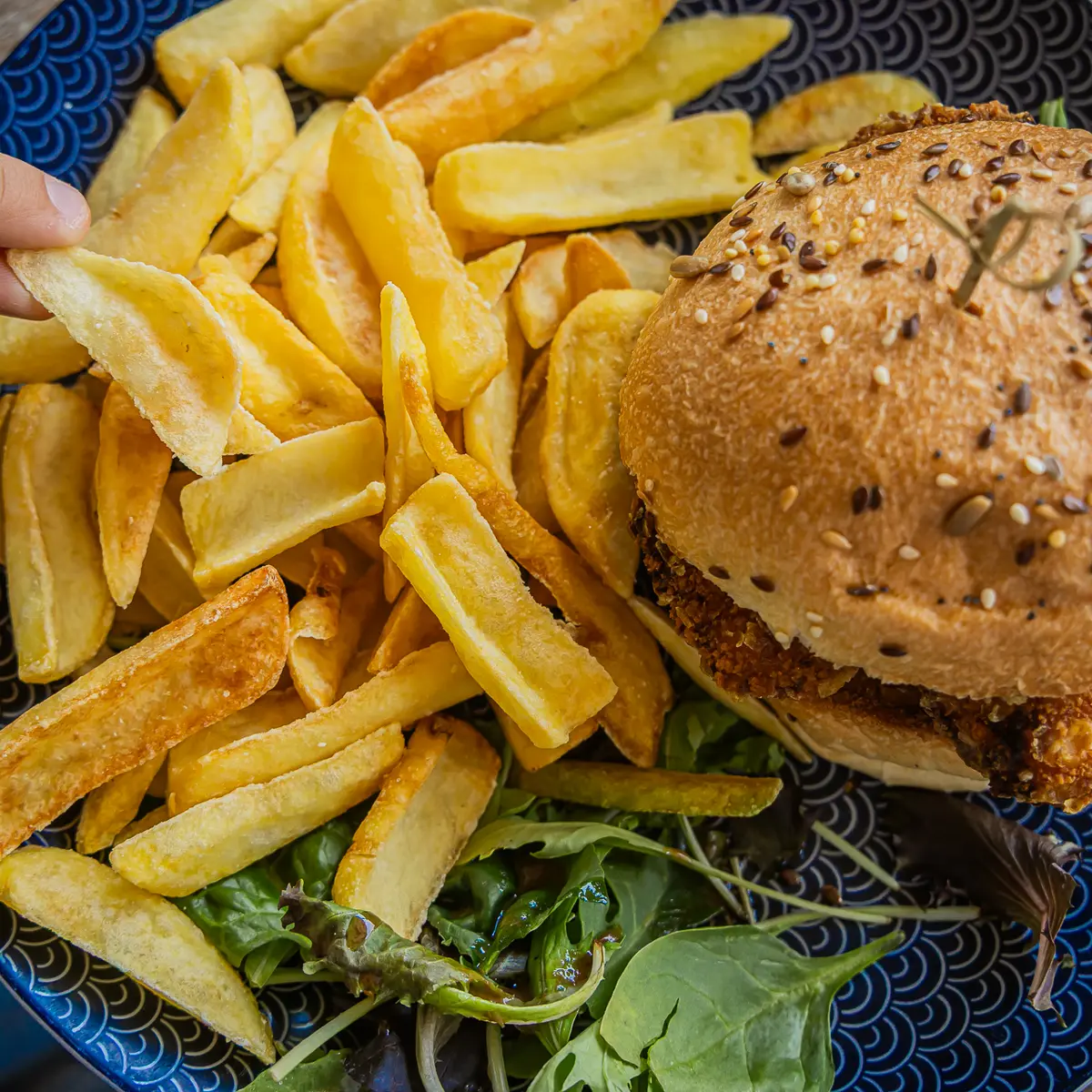 Régalez-vous de nos hamburgers maison, fish'n chips, steaks de bison, hot dog Manhattan, nuggets, salade type césar, salade nordique et steak haché frites.