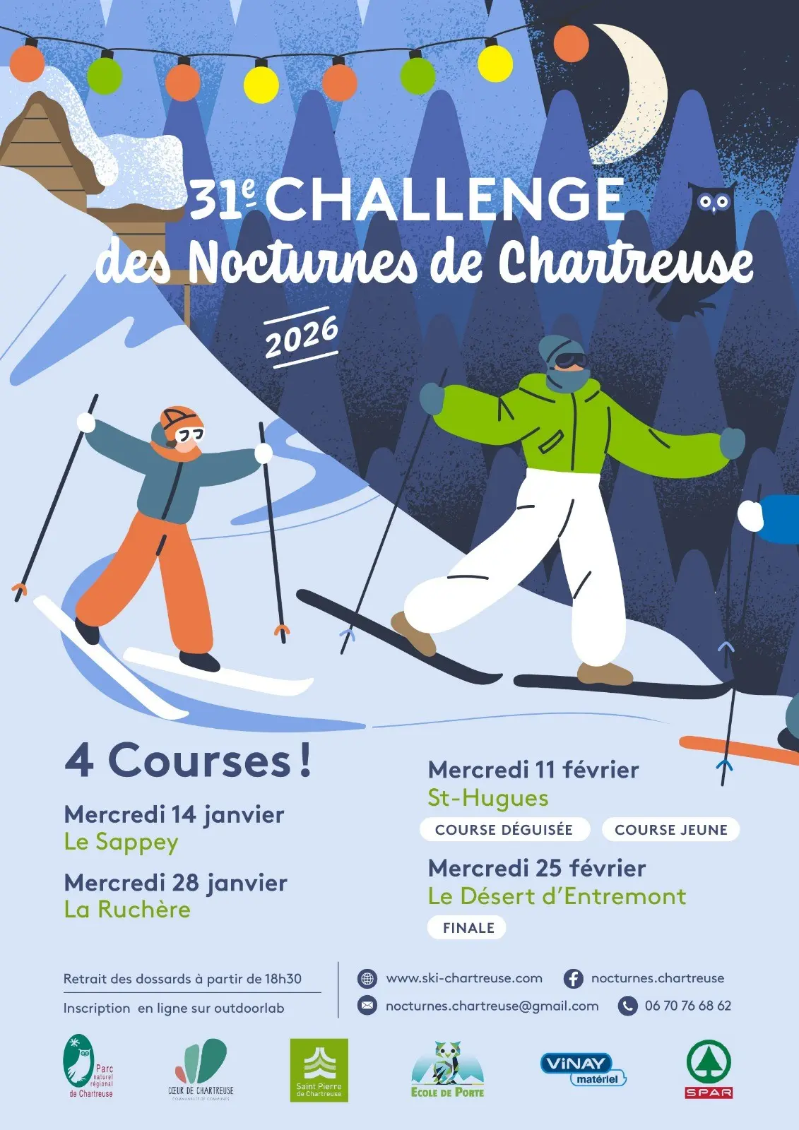 Le Challenge des Nocturnes de Chartreuse propose un circuit original de courses à l’américaine, en relais de ski nordique, organisé sur les 4 sites nordiques de Chartreuse. En soirée, les participants s’affrontent par équipes dans une ambiance conviviale, festive et sportive. Ce challenge met en avant le plaisir de la glisse, la découverte du massif de nuit et le partage d’un moment chaleureux au cœur des villages et sites nordiques de Chartreuse.