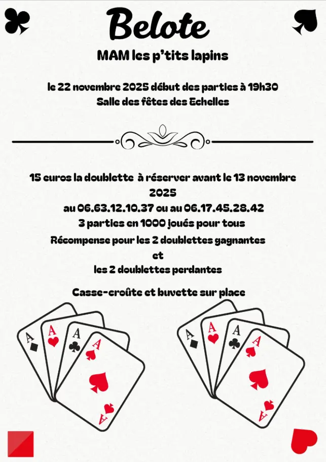 La MAM Les p'tits lapins organise sont concours de belote avec casse-croûte et buvette sur place. 3 parties en 1000 points.