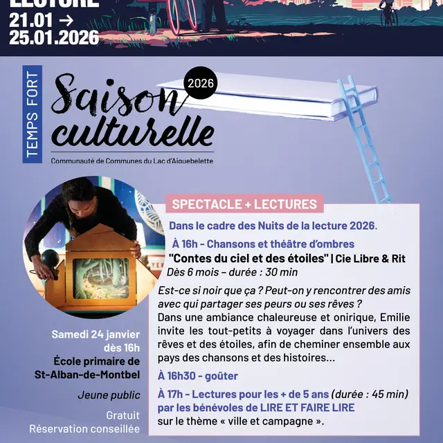 Dans le cadre des Nuits de la lecture, petits et grands sont invités à un moment chaleureux mêlant spectacle poétique autour des rêves et des étoiles, goûter convivial et lectures partagées. Une après-midi pour éveiller l’imaginaire et le plaisir de lire.
