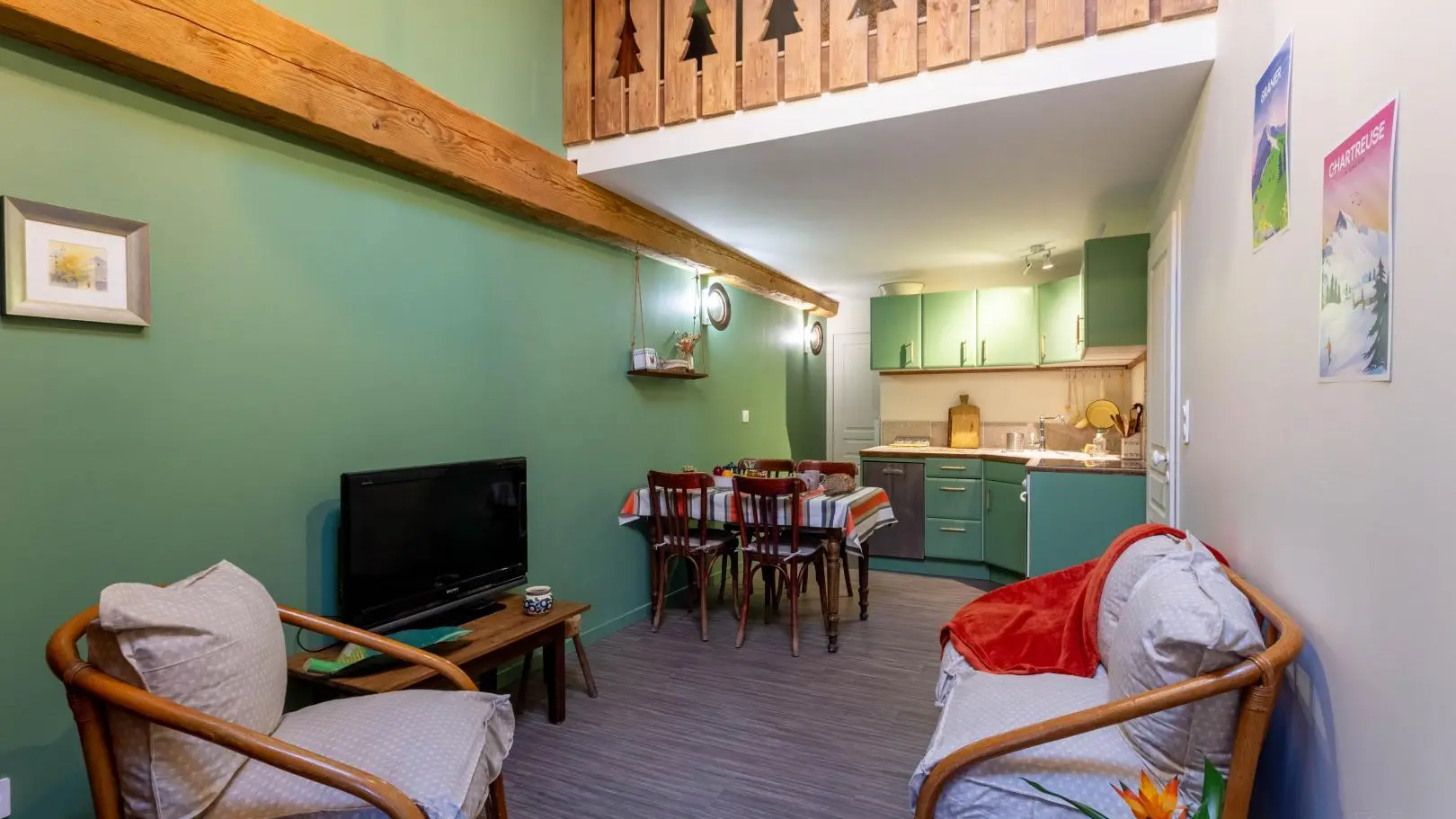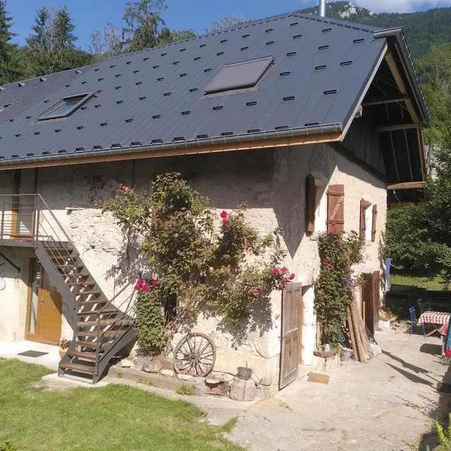 Gîte aménagé dans une partie de la maison des propriétaires, une ancienne ferme savoyarde entièrement rénovée. Accès indépendant par un escalier extérieur, donnant sur le séjour-cuisine. Salle de bains avec douche et WC. A l'étage, mezzanine avec canapé rapido express pour un couchage en 140 et chambre mansardée avec lit gigogne, (2 couchages en 80 ou 1 en 160). Espace réservé dans un jardin partagé avec les propriétaires, avec table, chaises et transat. Balançoires et autres jeux pour enfants. Mise à disposition possible de matériel pour bébés et jeux enfants.
