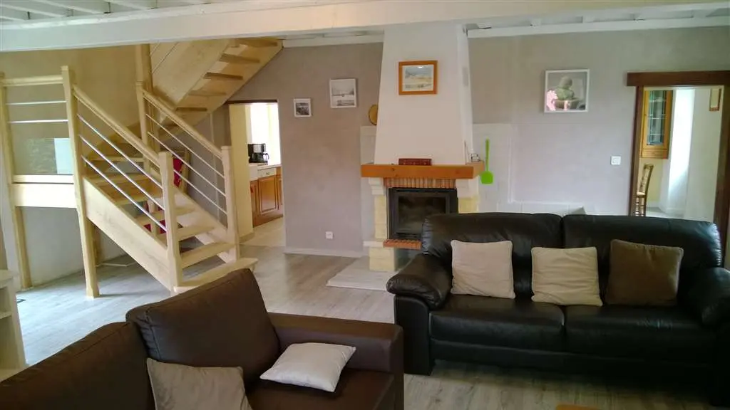 De plain pied : le salon avec cheminée et la cuisine sont ouverts sur la terrasse et le jardin. Salle d'eau et wc.