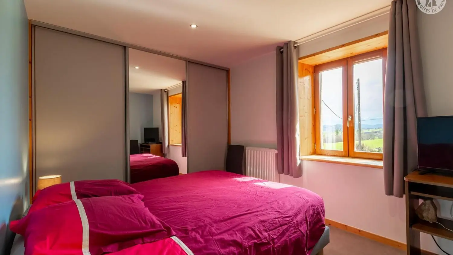 Maison de pays dans un ancien corps de ferme, à côté de la maison des propriétaires, avec une belle terrasse en partie abritée, donnant sur un vaste terrain. Gite spacieux et lumineux, bénéficiant d'une vue très dégagée sur la campagne et les montagnes.