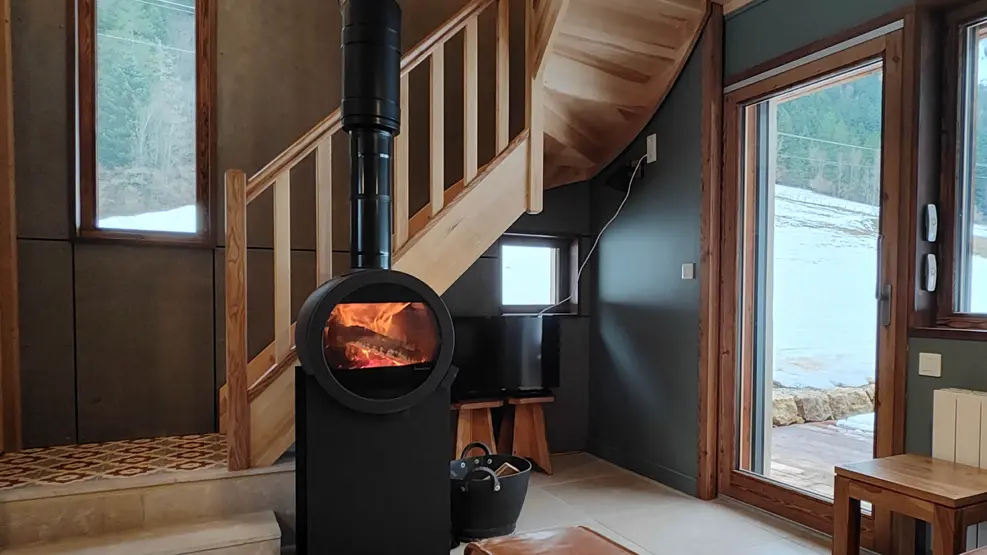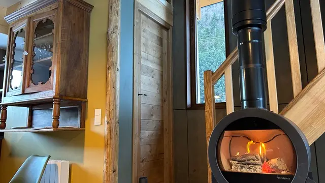 n’empêche pas le confort avec un canapé généreux dans lequel vous pourrez vous lover face au feu de bois qui crépite dans le poêle.