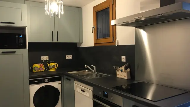 Pour souligner notre appartenance à la Destination Chartreuse nous avons suivi le code couleurs de la charte graphique utilisé par Chartreuse Tourisme dans la conception de la cuisine du gîte : vert d’eau pour l’éco-tourisme, ardoise pour le patrimoine préservé et bouton d’or pour la créativité artisanale.