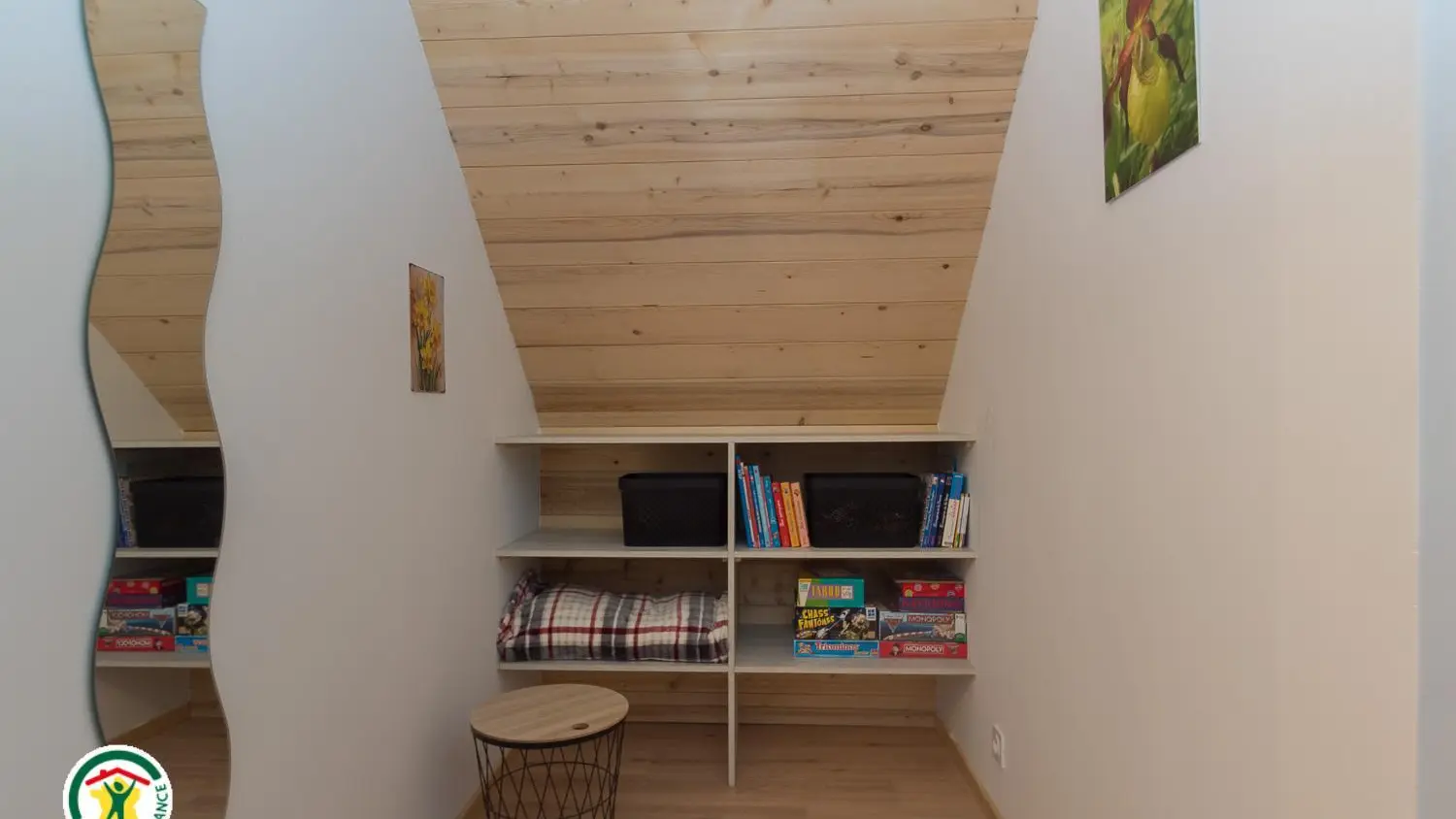 À l’étage : espace nuit pour petits et grands. Vous trouverez 4 chambres, 2 salles de bain avec douche + WC et un coin rangement.