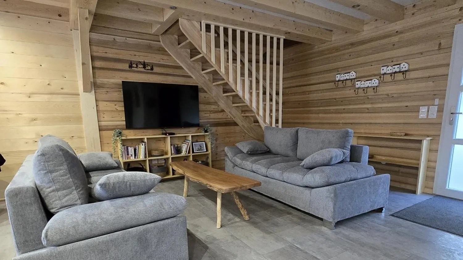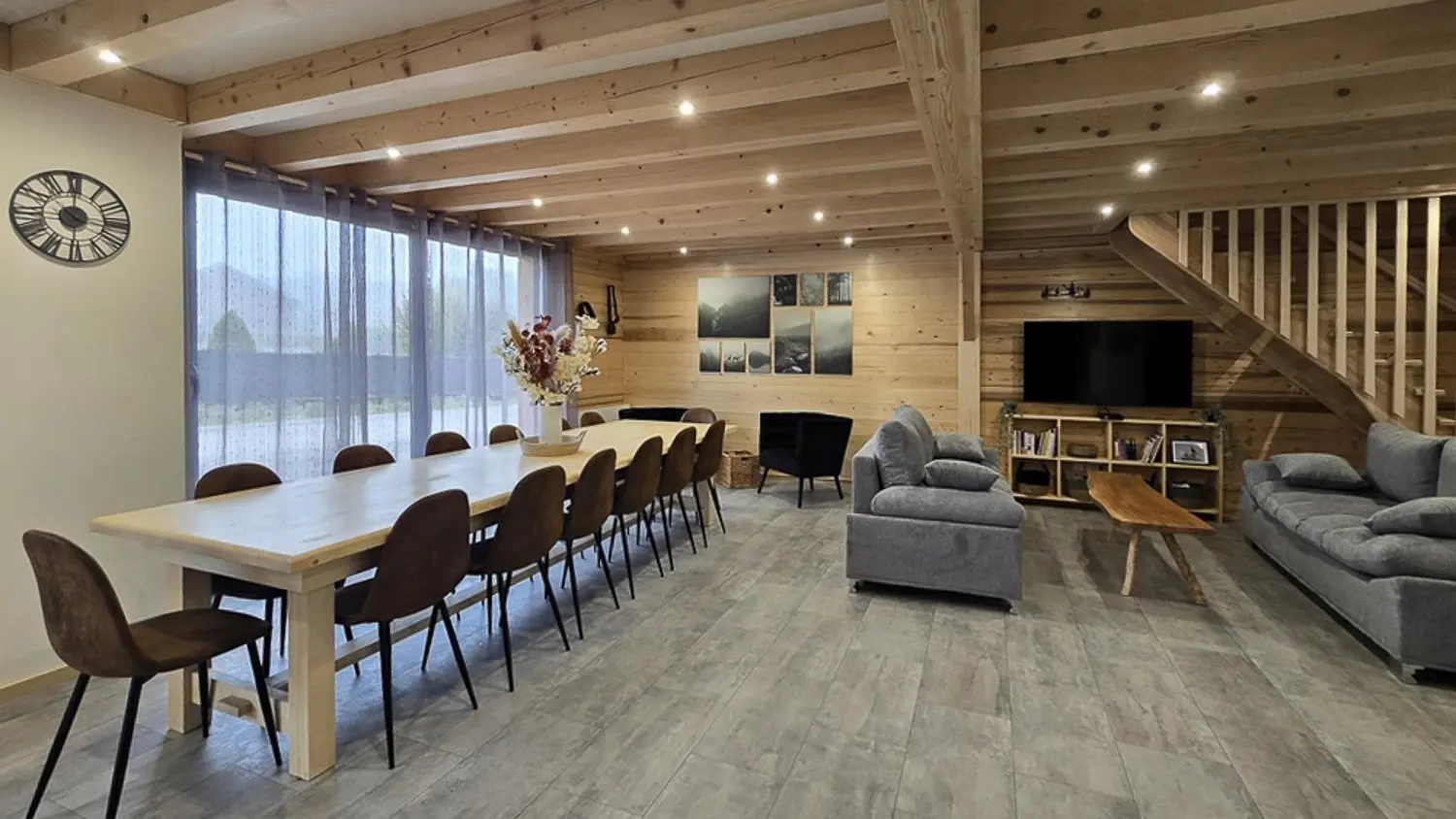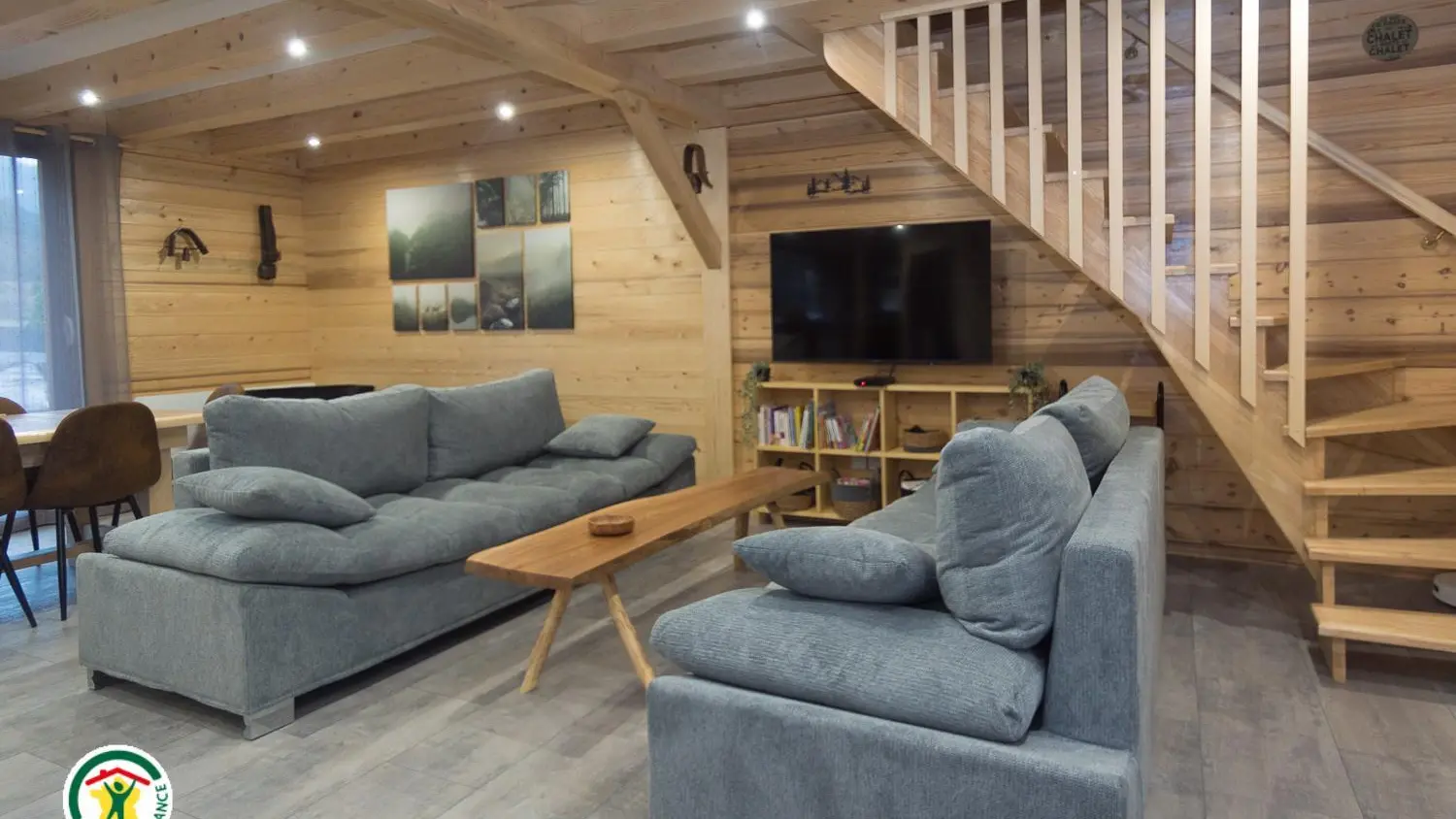 Notre maison se compose d'un rez-de-chaussée et d'un étage sur une superficie totale de 150m² dans une ambiance chaleureuse, à la fois conviviale et confortable, avec un esprit chalet idéal pour se ressourcer.