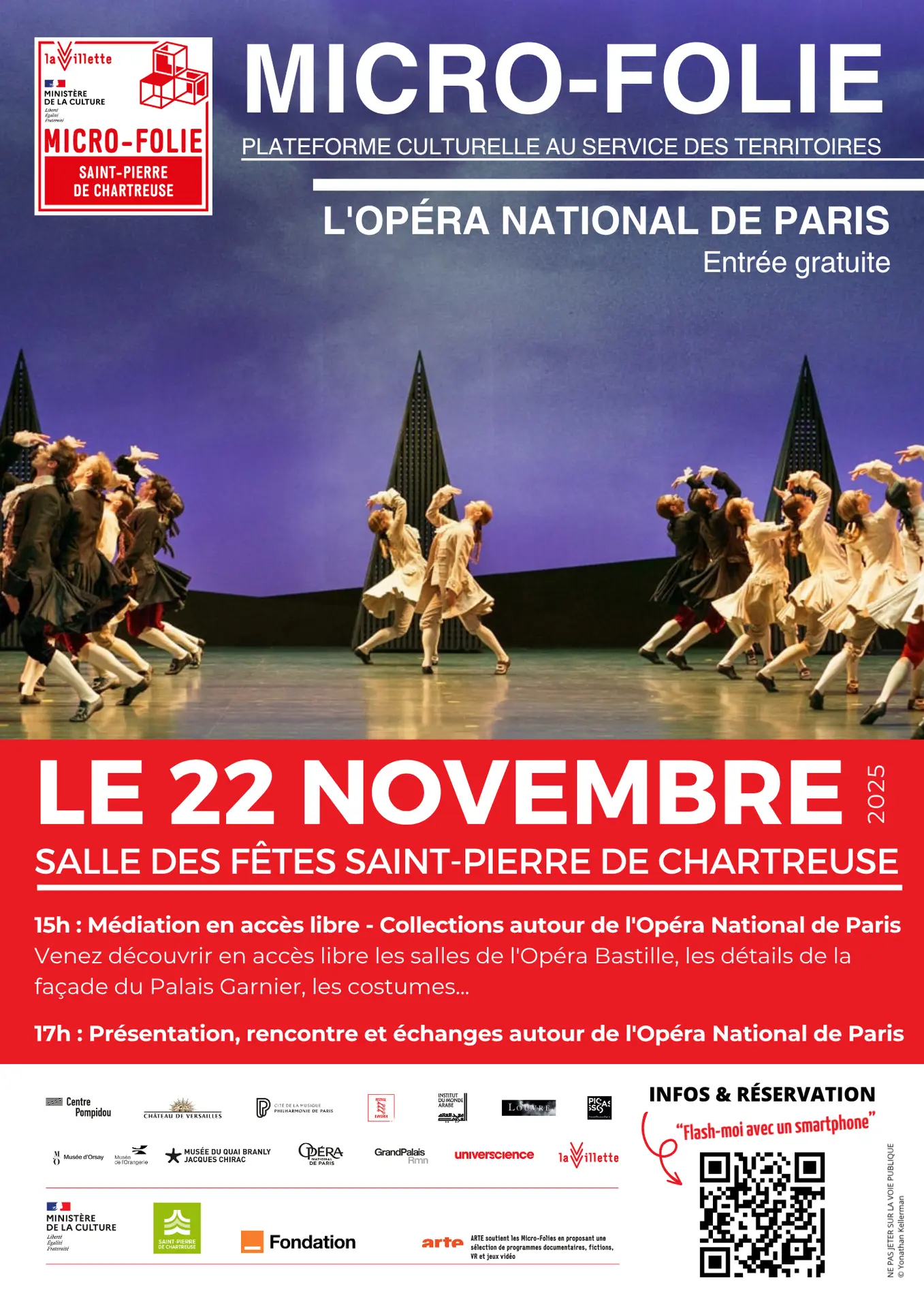 Le samedi 13 décembre sera projeté pour la première foi un spectacle de l'Opéra National de Paris. La rencontre du 22 novembre sera l'occasion de vous faire découvrir son fonctionnement et de répondre à toutes vos questions. Vous pouvez réserver une place gratuitement pour le 22 novembre à microfolie@saintpierredechartreuse.fr, ainsi qu'y poser vos questions sur le thème de l'Opéra de Paris."