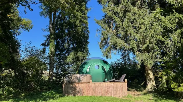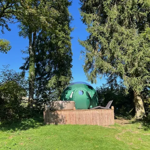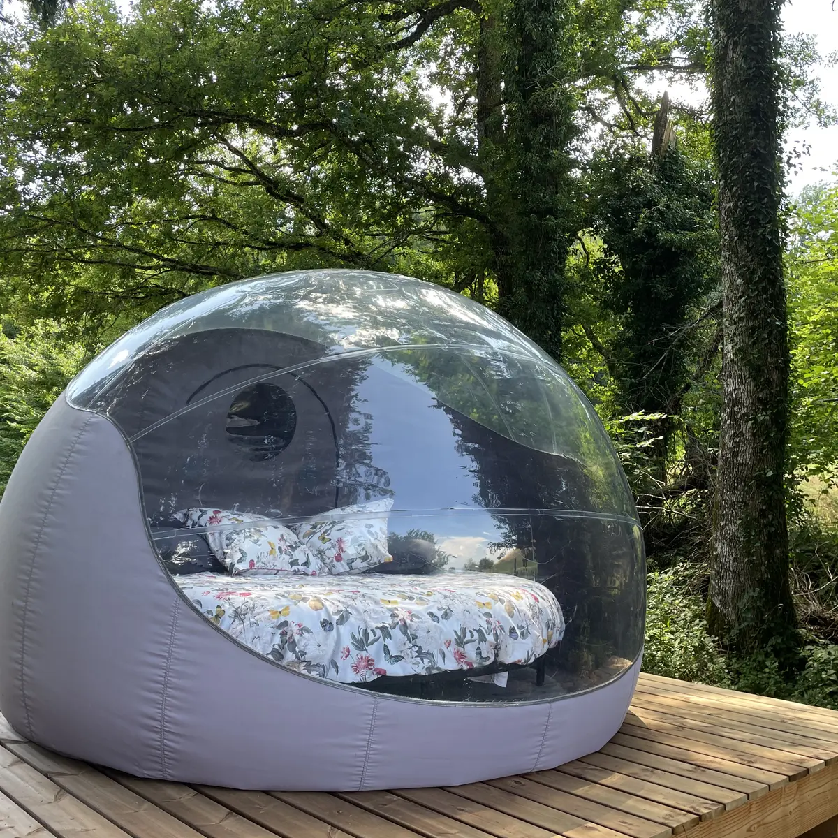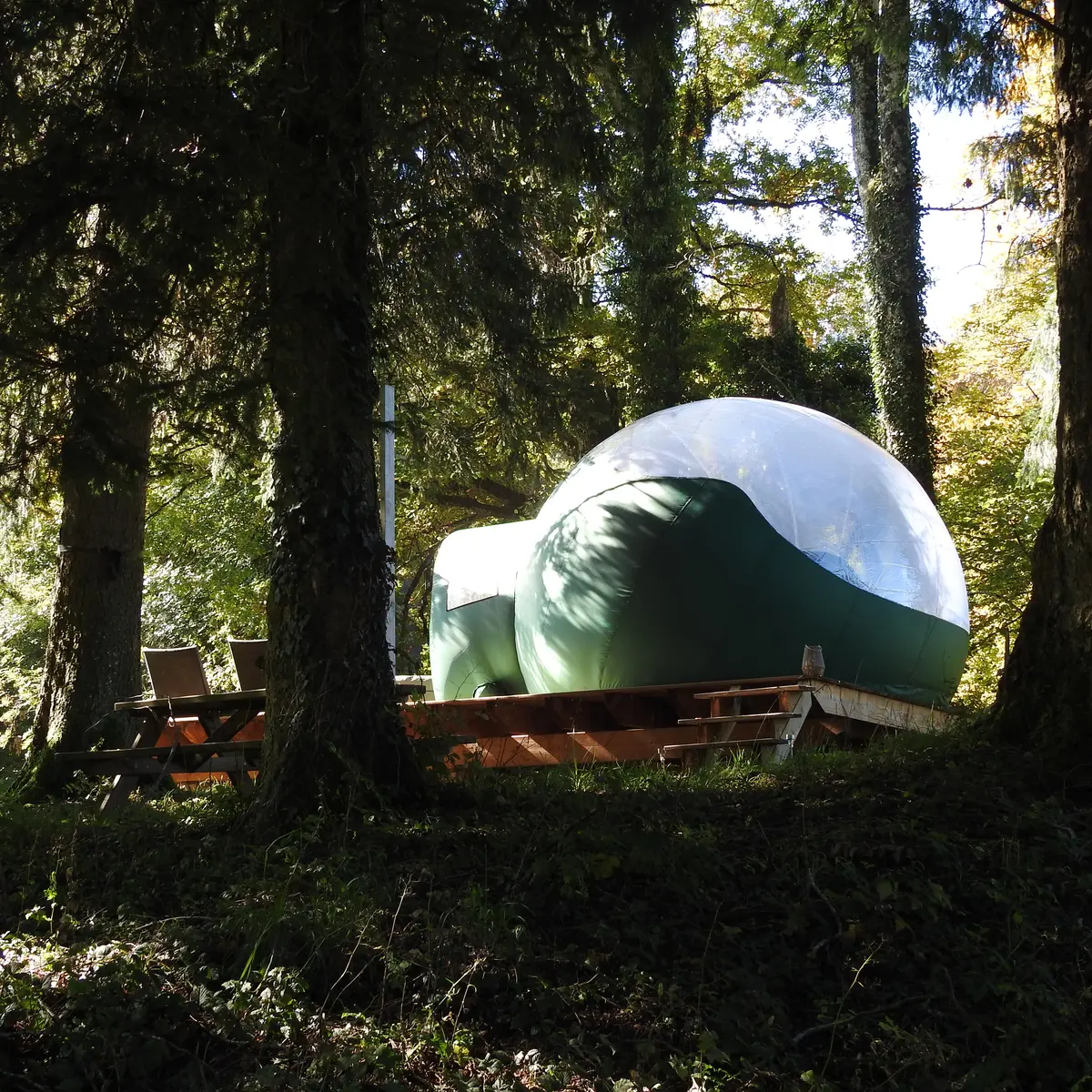 Amoureux de la nature, vivez une expérience incroyable en toute saison. Perchée sur sa terrasse en bois, votre bulle offre une vue à 360 degrés sur la nature environnante. Profitez d'un grand lit confortable de 220cm avec couette et couverture chauffante. La bulle dispose de l'électricité et d'une enceinte bluetooth lumineuse.