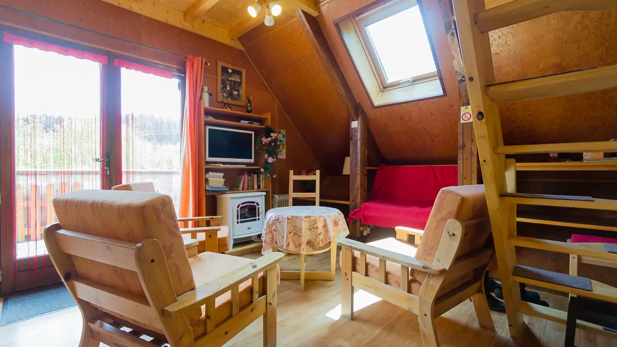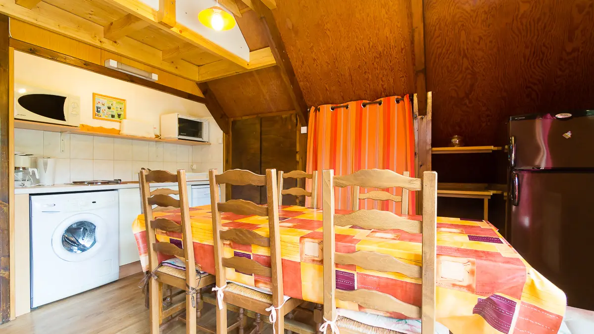Gîte individuel situé dans un lotissement de 4 chalets. Salle de séjour coin-cuisine (2 lits gigognes 1 pers.), Ch.1 (1 lit 2 pers.), Ch. cabine (2 lits 1 pers. superp.), s. d'eau, wc, forfait ménage à la demande. TV. Ch. élect., l-linge. Congél. m-ond...