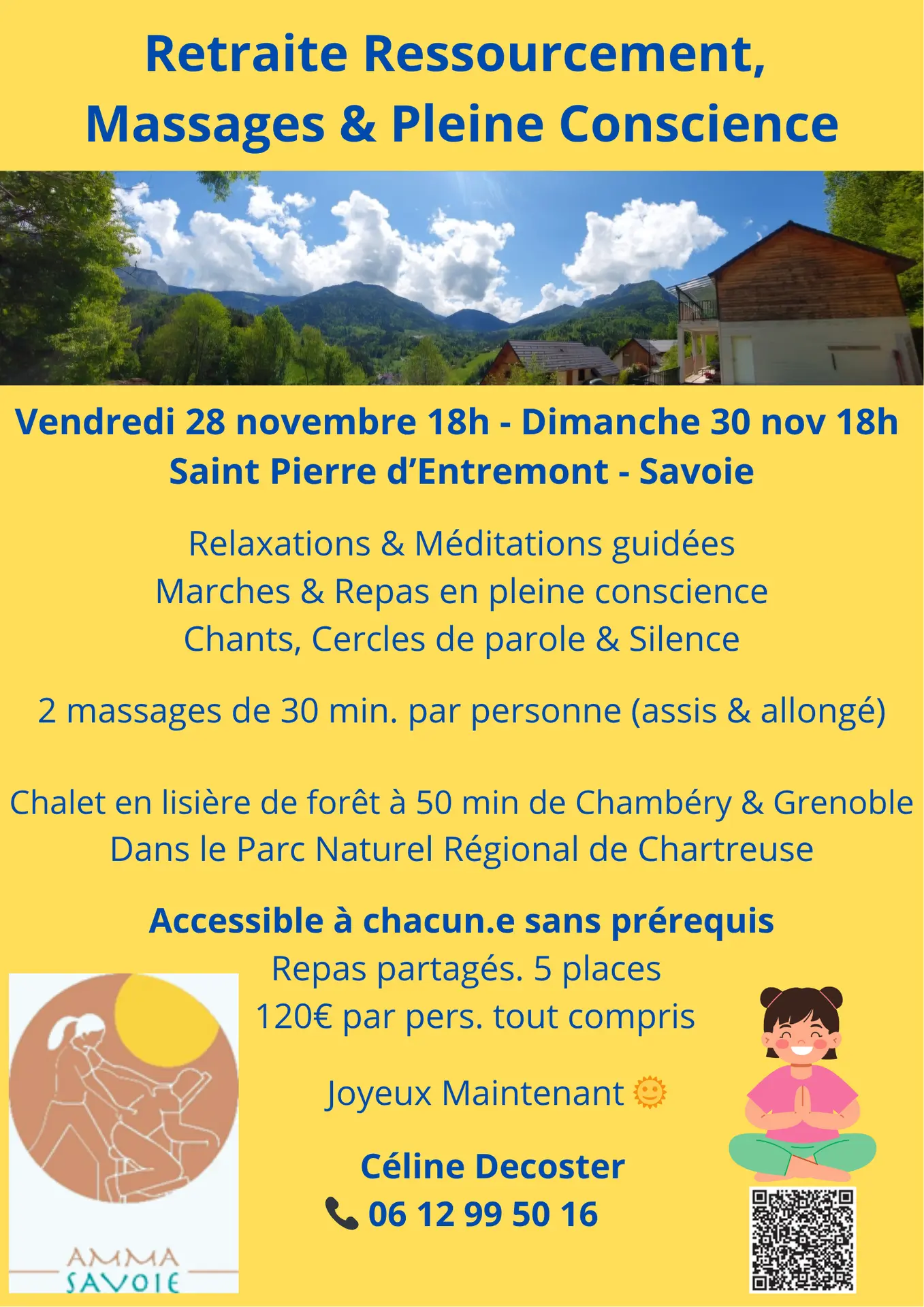 Céline Decoster vous propose ce week-end de ressourcement avec au programme : relaxation et méditations guidées, marche et repas pleine conscience, chants, cercles de parole et silence ainsi que 2 massages de 30 min par personne.