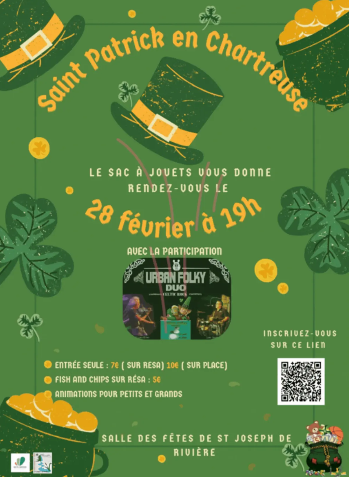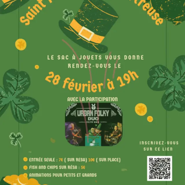 Le Sac à Jouets est ravi de vous inviter à La Saint-Patrick en Chartreuse, un événement unique qui alliera convivialité, musique et animations ! Rendez-vous le 28 février à 19h à la salle des fêtes de Saint-Joseph-de-Rivière pour une soirée mémorable.