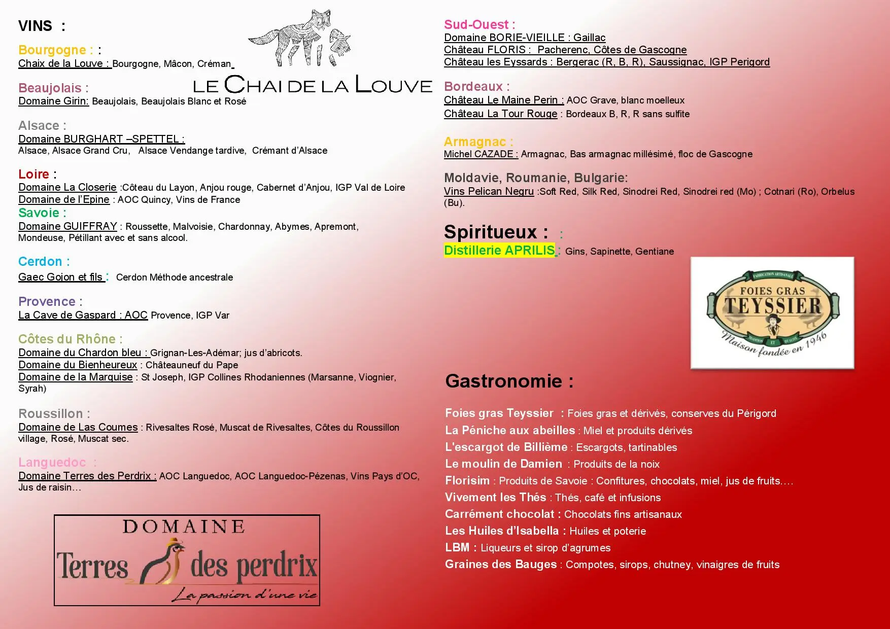 2 repas gastronomiques (produits en provenance directe des régions) :