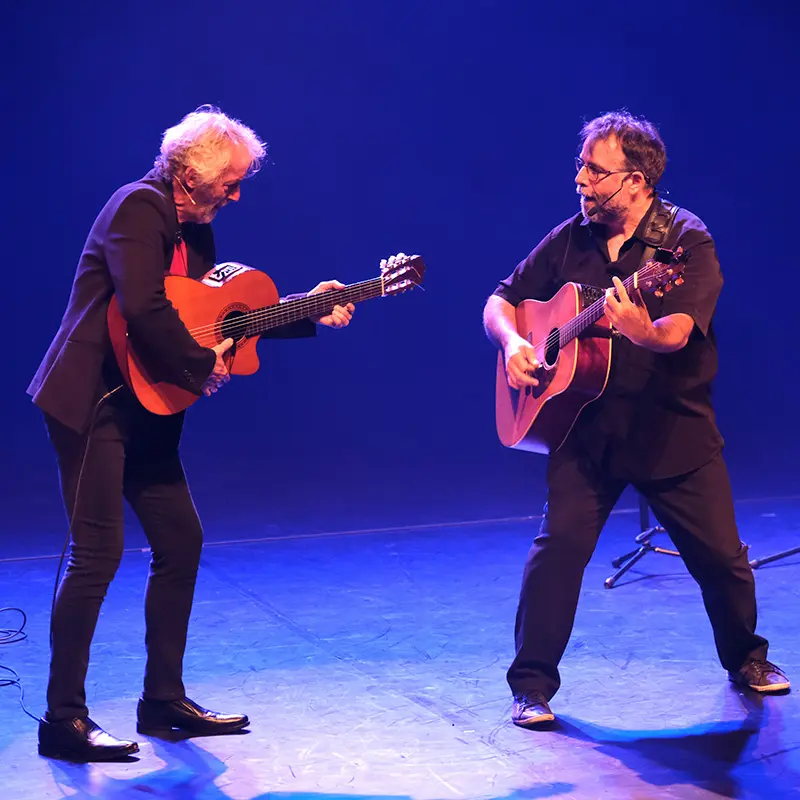 Jouant de leur même amour des mots, de leur même regard amusé sur la marche du monde et sur l’outrecuidance de leurs contemporains, ils se parlent, se lancent des défis, les relèvent à coup de bons mots, d’aphorismes, de chansons courtes, de gags, de vannes irrésistibles et de glissements sémantiques… complices, joueurs, heureux de partager leur folie douce avec le public.