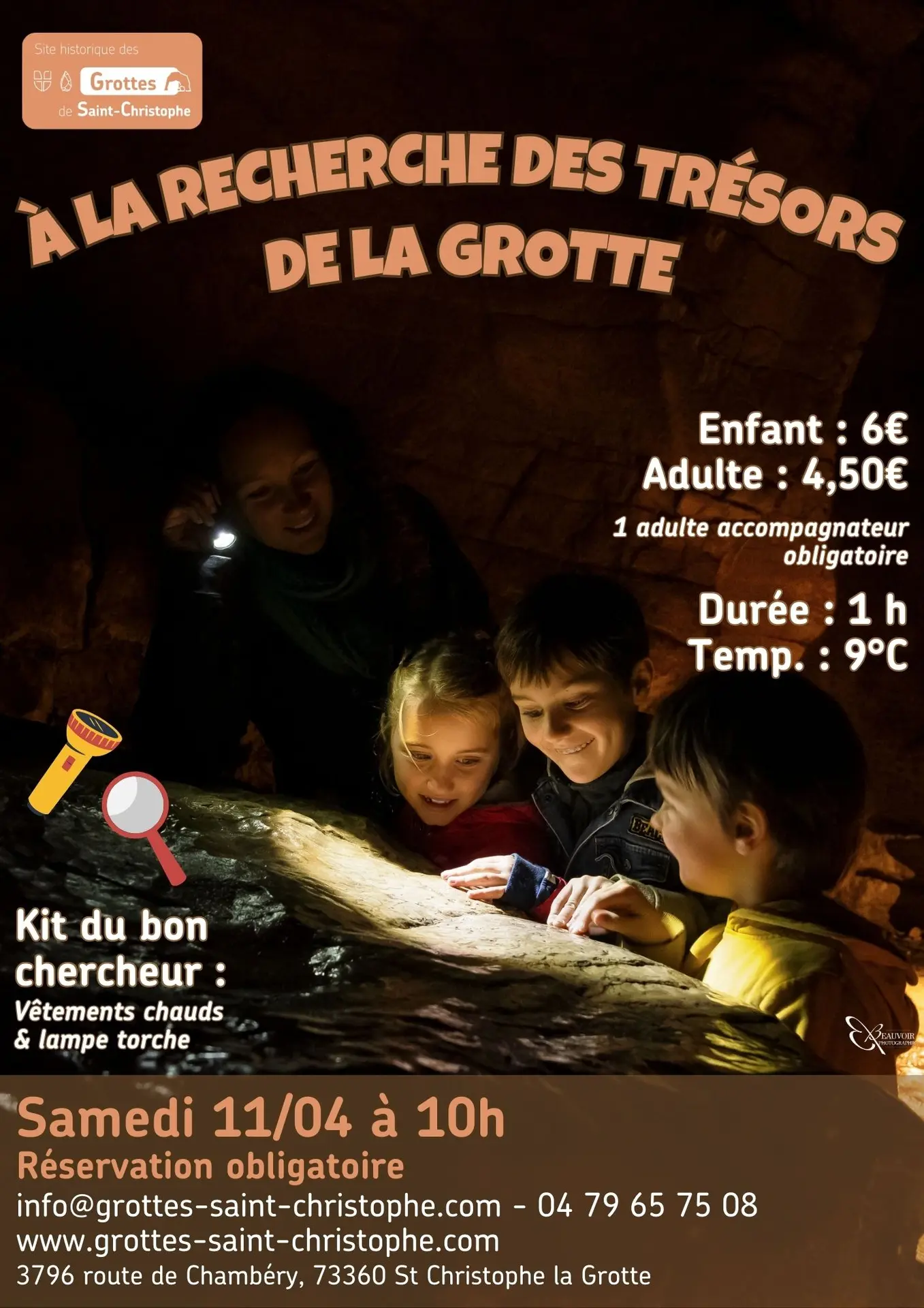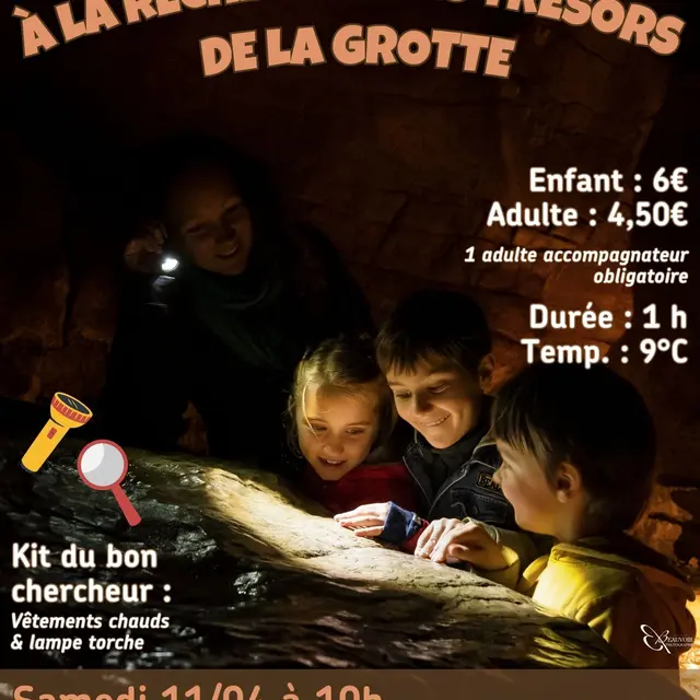 Partez à la découverte de la grotte supérieure et de ses trésors ! Une exploration à la lampe torche de la grotte supérieure pour découvrir ses secrets ! N’oubliez pas le kit du bon chercheur : des vêtements chauds et une lampe !